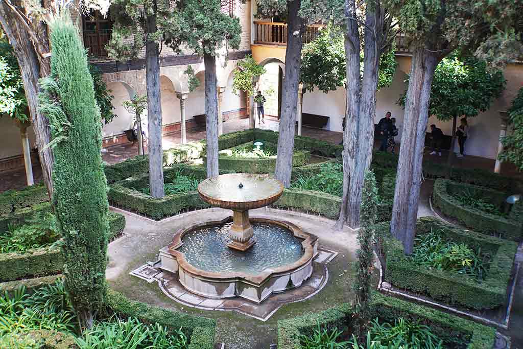 The Generalife gardens are also adjacent to the Nasrid Palace and are definitely a must-see. They were a respite for the royal family from the needs of the palace, where they could escape into nature – flowing waterfalls and fountains, lush gardens, fragrant trees, and novelties in every corner. There are minimal buildings here, though there are some because this was also a palace. The Generalife gardens are the best example of Arab gardens in Spain.