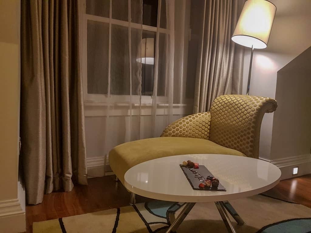 Hotel Indigo offers four different room categories, from the entry-level doubles to the king junior suites, and a series of accessible rooms as well. Rooms are spacious and bright, with pops of colour in the soft furnishings. My king-bedded room featured dormer windows and a casual seating area under the window, a work desk, and a compact bureau with flat screen television. Upon arriving, I found a beautiful fruit and chocolate tray welcoming me to the hotel.